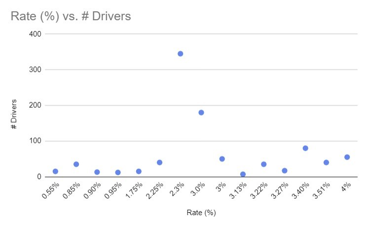 2) Lower rates aren’t correlated with a larger number of drivers, and once again this is genuinely surprising. If anything, having more drivers is negatively correlated with rates. This is bizarre since your intuition would suggest that larger companies would have more buying power and leverage to access lower rates. But that intuition would be wrong.